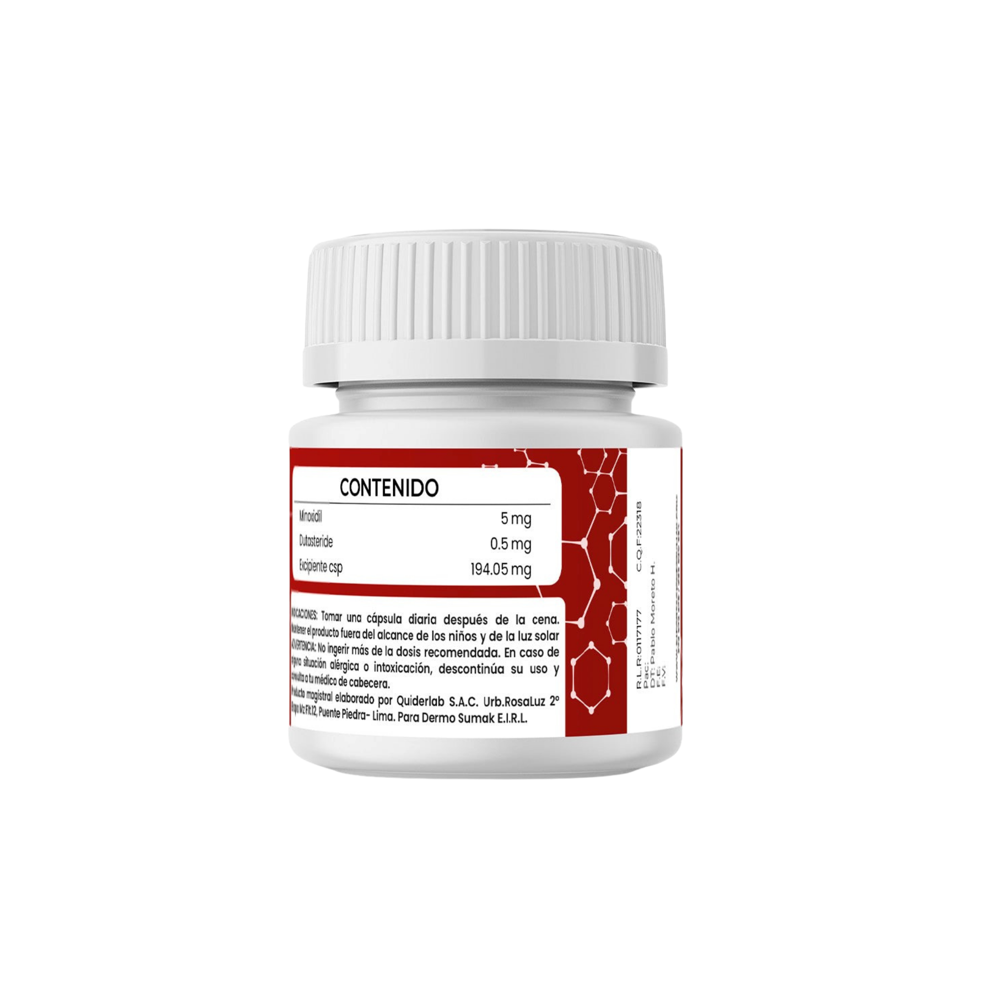 - Concentración: Minoxidil 5 mg / dutasterida 0.5 mg por cápsula