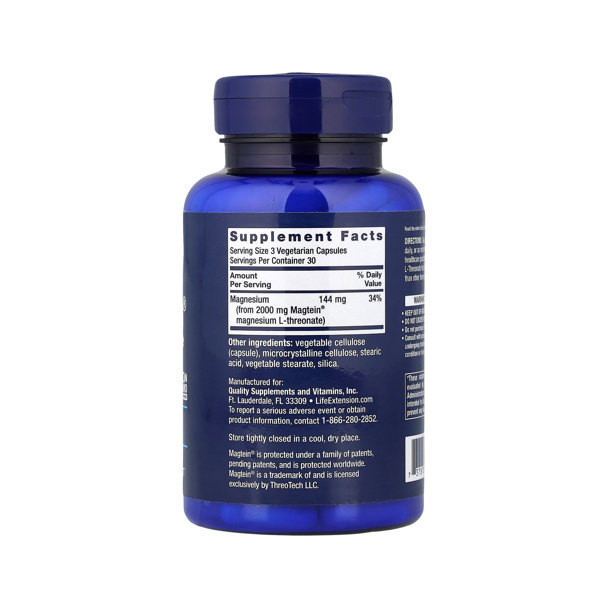- Concentración: 2,000 mg por porción (magnesio L-treonato) equivalente a ~144 mg de magnesio elemental